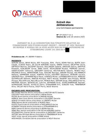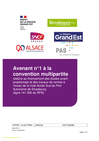 AVENANT N1 À LA CONVENTION MULTIPARTITE RELATIVE AU FINANCEMENT DES ÉTUDES AVANT-PROJET - PROJET ET DES TRAVAUX DE REMISE À NIVEAU DE LA VOIE ACCÈS SUD DU PORT AUTONOME DE STRASBOURG LIGNE 141 000 DU RF