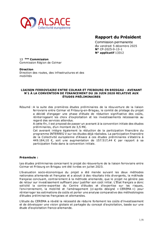 A la suite des premières études préliminaires de la réouverture de la liaison ferroviaire entre Colmar et Fribourg-en-Brisgau, le comité de pilotage du projet a décidé d'engager une phase d'étude de réduction significative des coûts, réinterrogeant les choix d'exploitation et les investissements nécessaires au regard des services attendus. A cette fin, il est proposé de passer un avenant à la convention initiale des études préliminaires, d'un montant de 3,5 M€. Cet avenant intègre également la réduction de la participation financière du programme INTERREG V sur les études déjà réalisées. La participation financière de la Collectivité européenne d'Alsace à ces études préliminaires s'établira à 449.184,10 €, soit une augmentation de 157.517,44 € par rapport à sa participation fixée dans la convention initiale.