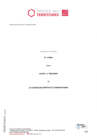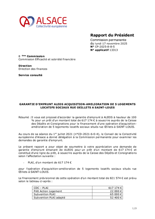Il vous est proposé d’accorder la garantie d'emprunt à ALEOS à hauteur de 100 % pour un prêt d’un montant total de 617 174 € à souscrire auprès de la Caisse des Dépôts et Consignations pour le financement d'une opération d’acquisition-amélioration de 5 logements locatifs sociaux situés rue Œillets à SAINT-LOUIS.