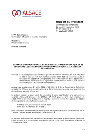 Il vous est proposé d’accorder la garantie d'emprunt à DOMIAL SA HLM à hauteur de 100 % pour un prêt d’un montant total de 2 906 305 € à souscrire auprès de la Caisse des Dépôts et Consignations pour le financement d'une opération de réhabilitation thermique de 23 logements locatifs sociaux situés 3,5 et 7 rue de l’Ancien Hôpital à MASEVAUX-NIEDERBRUCK.
