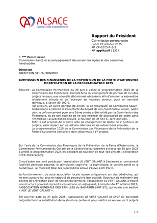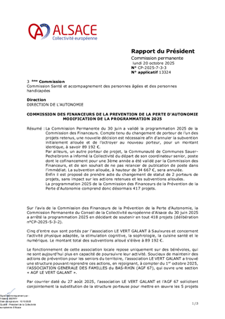 La Commission Permanente du 30 juin a validé la programmation 2025 de la Commission des Financeurs. Compte tenu du changement de porteur de l'un des projets retenus, une nouvelle décision est nécessaire afin d'annuler la subvention initialement allouée et de l'octroyer au nouveau porteur, pour un montant identique, à savoir 89 192 €. Par ailleurs, un autre porteur de projet, la Communauté de Communes Sauer-Pechelbronn a informé la Collectivité du départ de son coordinateur senior, poste dont le cofinancement pour une 3ème année a été validé par la Commission des Financeurs, et de son souhait de ne pas relancer de publication de poste dans l’immédiat. La subvention allouée, à hauteur de 34 667 €, sera annulée. Enfin il est proposé de prendre acte du changement de statut de 2 porteurs de projets, sans impact sur les actions retenues et les subventions allouées. La programmation 2025 de la Commission des Financeurs de la Prévention de la Perte d'Autonomie comprend donc désormais 417 projets.