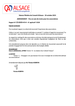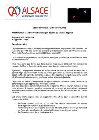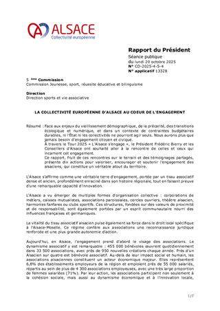 Face aux enjeux du vieillissement démographique, de la précarité, des transitions écologique et numérique, et dans un contexte de contraintes budgétaires durables, ni l'État ni les collectivités ne pourront agir seuls. Nous aurons plus que jamais besoin d'engagement citoyen et civique. À travers le Tour 2025 « L’Alsace s’engage », le Président Frédéric Bierry et les Conseillers d’Alsace ont souhaité aller à la rencontre de celles et ceux qui incarnent cet engagement. Ce rapport, fruit de ces rencontres sur le terrain et des témoignages partagés, présente dix actions pour valoriser, encourager et soutenir l’engagement des alsaciens, qui constitue un véritable atout du territoire.