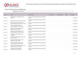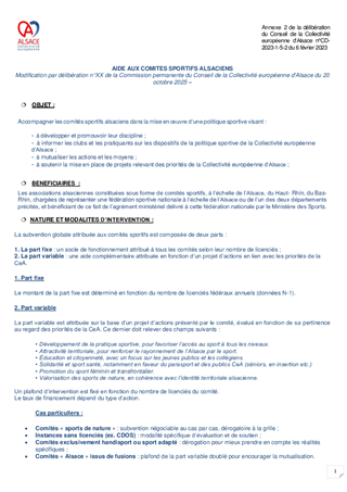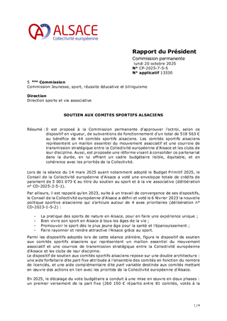 Il est proposé à la Commission permanente d'approuver l'octroi, selon ce dispositif en vigueur, de subventions de fonctionnement d'un total de 518 563 € au bénéfice de 44 comités sportifs alsaciens. Les comités sportifs alsaciens représentent un maillon essentiel du mouvement associatif et une courroie de transmission stratégique entre la Collectivité européenne d’Alsace et les clubs de leur discipline. Aussi, est proposée une réforme visant à consolider ce partenariat dans la durée, en lui offrant un cadre budgétaire lisible, équitable, et en cohérence avec les priorités de la Collectivité.