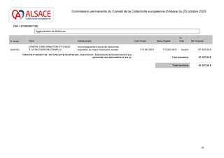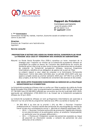 Le Fonds Social Européen Plus (FSE+) constitue un levier important de la stratégie pour l’insertion et l’emploi de la Collectivité européenne d’Alsace en complétant les crédits en faveur de l’inclusion des bénéficiaires du revenu de Solidarité active (rSa) et de la lutte contre la pauvreté des personnes en situation de précarité. La Collectivité européenne d’Alsace, reconnue Organisme Intermédiaire, bénéficie d’une délégation de gestion de la part de l’Etat. Le présent rapport a pour objet de proposer à la Commission Permanente d’approuver l’octroi des aides sollicitées pour la période 2023-2025 suite aux appels à projets lancés au premier semestre 2025 pour 137 052 € au profit de deux projets, et de fixer les modalités de versement des avances et des soldes.