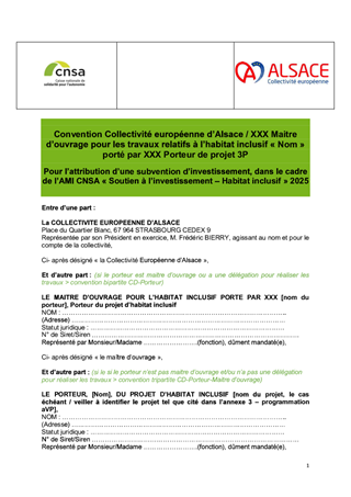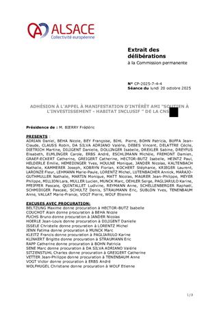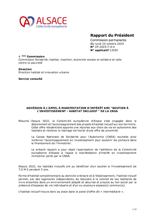 Depuis 2022, la Collectivité européenne d’Alsace s’est engagée dans le déploiement et l’accompagnement des projets d’habitat inclusif sur son territoire. Cette offre résidentielle apporte une réponse aux choix de vie en autonomie des habitats et renforce le maillage territorial d’une offre de proximité. La Caisse Nationale de Solidarité pour l’Autonomie (CNSA) souhaite ainsi renforcer l’accompagnement en investissement pour soutenir les porteurs dans le financement de l’immobilier. Le présent rapport a pour objet l'approbation de l'adhésion de la Collectivité européenne d'Alsace à l’appel à manifestation d’intérêt en investissement immobilier porté par la CNSA.