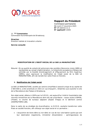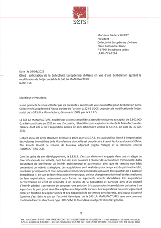 En sa qualité de collectivité actionnaire des sociétés d’économie mixte (SEM) et représentée au conseil d’administration, la Collectivité européenne d’Alsace est sollicitée par la Société d'aménagement et d'Équipement du Rhin Supérieur (SERS), pour approuver la modification de l’objet social de la SAS LA MANUFACTURE, afin de transformer cette filiale en foncière.