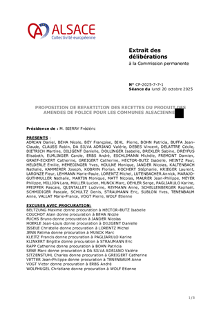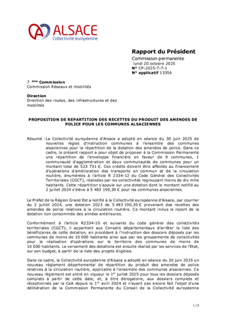 La Collectivité européenne d’Alsace a adopté en séance du 30 juin 2025 de nouvelles règles d’instruction communes à l’ensemble des communes alsaciennes pour la répartition de la dotation des amendes de police. Dans ce cadre, le présent rapport a pour objet de proposer à la Commission Permanente une répartition de l’enveloppe financière en faveur de 9 communes, 1 communauté d'agglomération et deux communautés de communes pour un montant total de 523 731 €. Ces crédits doivent être affectés au financement d’opérations d’amélioration des transports en commun et de la circulation routière, énumérées à l’article R 2334-12 du Code Général des Collectivités Territoriales (CGCT), réalisées par les collectivités regroupant moins de dix mille habitants. Cette répartition s’appuie sur une dotation dont le montant notifié au 2 juillet 2024 s’élève à 5 483 190,30 € pour les communes alsaciennes.