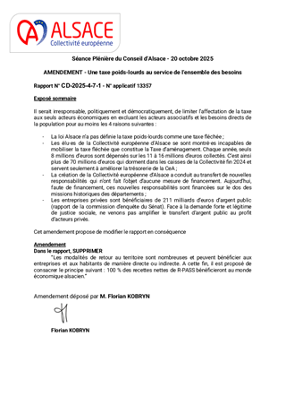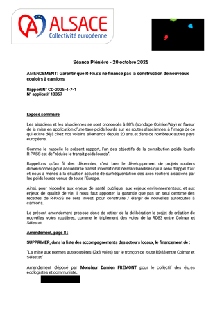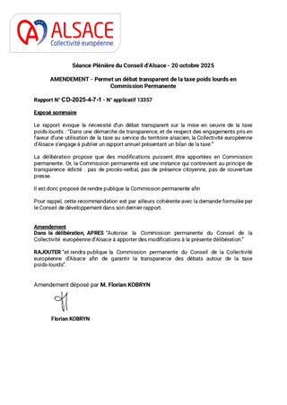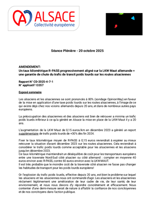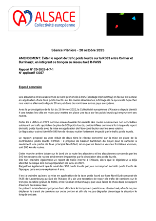 Le projet de taxe poids lourds « R-PASS » a vu le jour dès la création de la Collectivité européenne d’Alsace, dans l’objectif de réguler le trafic sur les grands axes alsaciens en soumettant le transport routier de marchandises – et exclusivement celui-ci – à une contribution spécifique. Par délibération du 21 octobre 2024, l’assemblée plénière de la Collectivité européenne d’Alsace s’est prononcée à l’unanimité en faveur de la mise en place de « R-PASS » et a cadré la poursuite des travaux et de la concertation. Conformément au planning annoncé, un marché a été notifié avec un opérateur qui sera en charge de la collecte et du contrôle de la taxe. En parallèle, la concertation s’est poursuivie et intensifiée en 2025 à trois niveaux (sur le plan institutionnel, avec les acteurs de l’économie alsacienne, avec la société civile). Le présent rapport vise désormais à définir les modalités d’application de la taxe poids lourds pour une mise en service de cette dernière le 1er janvier 2027. Les points suivants sont soumis au vote : - Définition de la grille tarifaire, ainsi que les modalités de réduction selon la fréquence d’utilisation du réseau taxé (cf. Annexe 1) ; - Définition du réseau taxé (cf. Annexe 2) ; - Définition des véhicules taxés et des exonérations mises en place (cf. Annexe 3) ; - Déclaration de secteur de télépéage (cf. Annexe 4) ; - Lettre d’intention (cf. Annexe 5) - Approbation de la convention avec l’Agence Nationale de Traitement Automatisé des Infractions (cf. Annexe 6) ; - Définition des modalités de sanctions en cas de fraude ; - Validation de la création d’un comité de suivi et des principes d’accompagnement des acteurs économiques du territoire.
