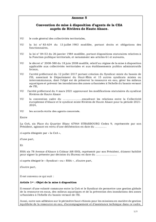 Rivières de Haute Alsace (RHA) est un syndicat mixte à la carte dont la Collectivité européenne d’Alsace (CeA) est membre et dont l’objet est de préserver la ressource en eau, gérer les milieux aquatiques et prévenir les inondations des zones urbanisées à l’échelle du bassin versant de l’Ill. Une première convention de partenariat a été passée en 2018 entre ce syndicat et le Département du Haut-Rhin. Elle arrive à échéance fin 2021 mais il est nécessaire de la renouveler en l’adaptant dès le 1er juillet 2021 pour tenir compte, non seulement des nouveaux statuts de RHA, en vigueur depuis le mois de mars 2021, mais également des mises à dispositions de personnels à reconduire. Ce renouvellement a ainsi vocation à permettre à RHA et à la CeA de poursuivre leur partenariat et de consolider les acquis au bénéfice du territoire concerné.