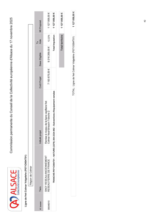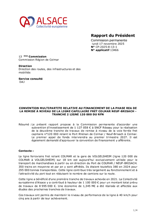 Le présent rapport propose à la Commission permanente d’accorder une subvention d'investissement de 1 127 058 € à SNCF Réseau pour la réalisation de la deuxième tranche de travaux de remise à niveau de la voie ferrée fret capillaire n°120 000 reliant le Port Rhénan de Colmar / Neuf-Brisach à Colmar. Le premier appel de fonds interviendra au premier trimestre 2027. Il est également demandé d’approuver la convention de financement y afférente.