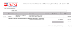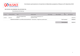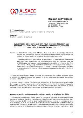 La Collectivité européenne d’Alsace, dans le cadre de sa politique éducative attribue des subventions pour les voyages et sorties scolaires organisés par les collèges et écoles publics et privés du Bas-Rhin et du Haut-Rhin. Le présent rapport a pour objet de proposer à la Commission permanente d’attribuer des subventions de fonctionnement pour un montant total de 14 291 €, pour les voyages scolaires des collèges publics et privés du Bas-Rhin (192 élèves – 4 voyages), les sorties scolaires avec nuitées pour les collèges et écoles publics et privés du Haut-Rhin (21 élèves – 1 sortie scolaire avec nuitées), et les sorties vers les lieux de mémoire des collèges publics et privés (516 élèves - 5 visites).
