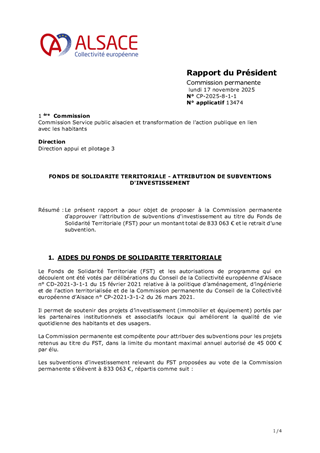Le présent rapport a pour objet de proposer à la Commission permanente d'approuver l'attribution de subventions d'investissement au titre du Fonds de Solidarité Territoriale (FST) pour un montant total de 833 063 € et le retrait d'une subvention.