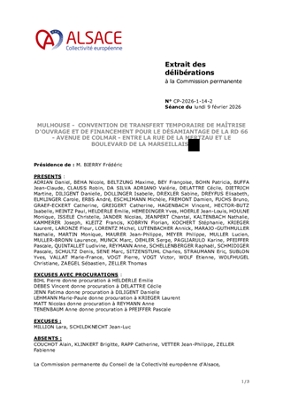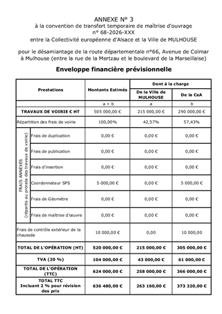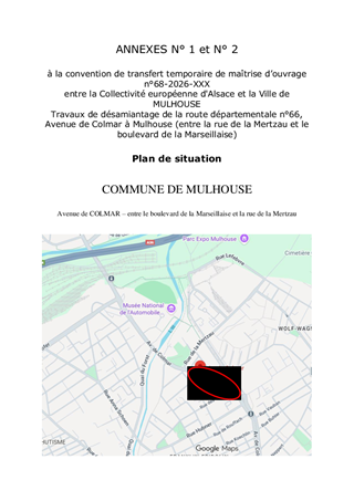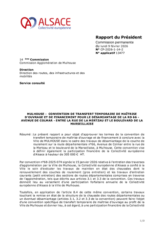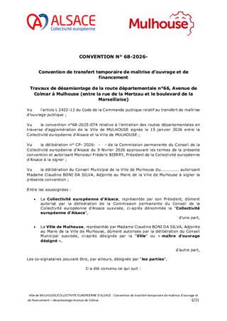 Le présent rapport a pour objet d'approuver les termes de la convention de transfert temporaire de maîtrise d'ouvrage et de financement à conclure avec la Ville de MULHOUSE dans le cadre des travaux de désamiantage de la couche de roulement sur la route départementale n°66, Avenue de Colmar entre la rue de la Mertzau et le boulevard de la Marseillaise, à Mulhouse. Cette convention vise à définir également la participation financière de la Collectivité européenne d'Alsace à hauteur de 305 000 € HT.