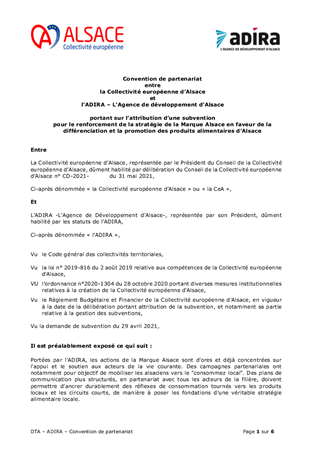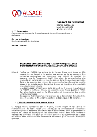 Portées par l'ADIRA, les actions de la Marque Alsace sont d'ores et déjà concentrées sur l'appui et le soutien aux acteurs de la vie courante. Des campagnes partenariales ont notamment pour objectif de mobiliser les alsaciens vers le "consommez local". Des plans de communication plus structurés, en partenariat avec tous les acteurs de la filière, doivent permettre d'ancrer durablement des réflexes de consommation tournés vers les produits locaux et les circuits courts, de manière à poser les fondations d'une véritable stratégie alimentaire locale. Le présent rapport s'inscrit dans cette perspective. Il propose le déploiement via l'ADIRA et la Marque Alsace, en association avec Alsace Qualité et l'ARIA, d'un plan d'actions basé sur la différenciation et la promotion des produits alimentaires d'Alsace. Ce rapport a fait l'objet d'un avis favorable de la Commission de l'Attractivité Economique et de la Transition Energétique et Ecologique du 10 mai 2021.