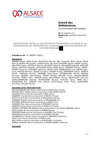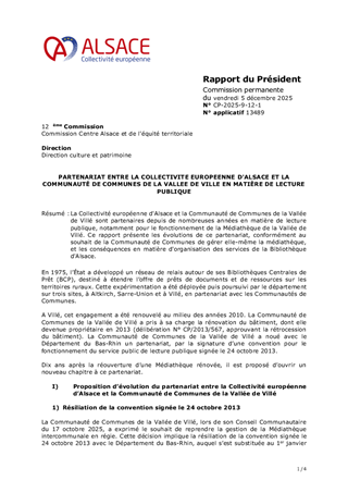 La Collectivité européenne d'Alsace et la Communauté de Communes de la Vallée de Villé sont partenaires depuis de nombreuses années en matière de lecture publique, notamment pour le fonctionnement de la Médiathèque de la Vallée de Villé. Ce rapport présente les évolutions de ce partenariat, conformément au souhait de la Communauté de Communes de gérer elle-même la médiathèque, et les conséquences en matière d'organisation des services de la Bibliothèque d'Alsace.