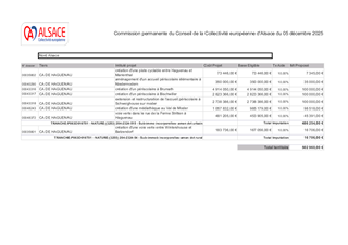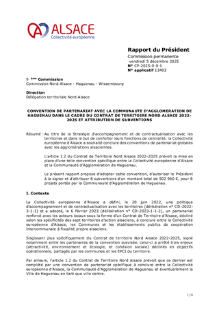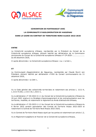 Au titre de la Stratégie d’accompagnement et de contractualisation avec les territoires et dans le but de conforter leurs fonctions de centralité, la Collectivité européenne d’Alsace a souhaité conclure des conventions de partenariat globales avec les agglomérations alsaciennes. L’article 1.2 du Contrat de Territoire Nord Alsace 2022-2025 prévoit la mise en place d’une telle convention spécifique entre la Collectivité européenne d’Alsace et la Communauté d’Agglomération de Haguenau. Le présent rapport propose d’adopter cette convention, d’autoriser le Président à la signer et d’attribuer 8 subventions d'un montant total de 502 960 €, pour 8 projets portés par la Communauté d’Agglomération de Haguenau.