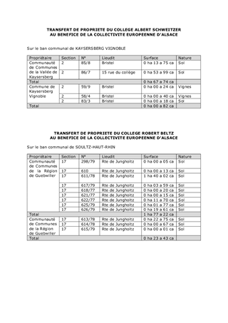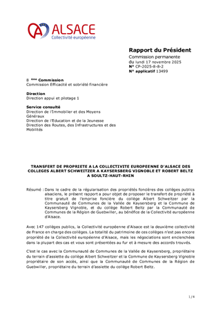 Dans le cadre de la régularisation des propriétés foncières des collèges publics alsaciens, le présent rapport a pour objet de proposer le transfert de propriété à titre gratuit de l’emprise foncière du collège Albert Schweitzer par la Communauté de Communes de la Vallée de Kaysersberg et la Commune de Kaysersberg Vignoble, et du collège Robert Beltz par la Communauté de Communes de la Région de Guebwiller, au bénéfice de la Collectivité européenne d’Alsace.
