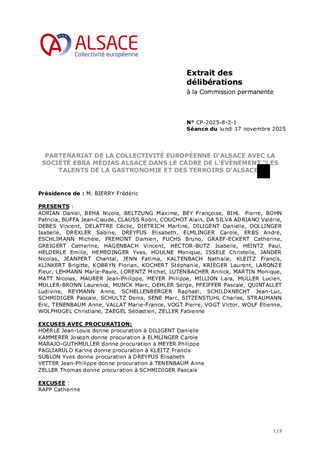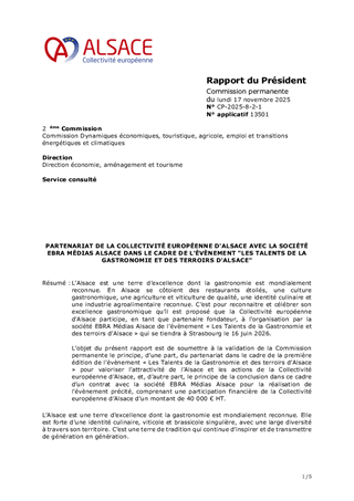 L’Alsace est une terre d’excellence dont la gastronomie est mondialement reconnue. En Alsace se côtoient des restaurants étoilés, une culture gastronomique, une agriculture et viticulture de qualité, une identité culinaire et une industrie agroalimentaire reconnue. C’est pour reconnaitre et célébrer son excellence gastronomique qu’il est proposé que la Collectivité européenne d'Alsace participe, en tant que partenaire fondateur, à l’organisation par la société EBRA Médias Alsace de l’évènement « Les Talents de la Gastronomie et des terroirs d’Alsace » qui se tiendra à Strasbourg le 16 juin 2026. L’objet du présent rapport est de soumettre à la validation de la Commission permanente le principe, d’une part, du partenariat dans le cadre de la première édition de l’évènement « Les Talents de la Gastronomie et des terroirs d’Alsace » pour valoriser l’attractivité de l’Alsace et les actions de la Collectivité européenne d’Alsace, et, d’autre part, le principe de la conclusion dans ce cadre d’un contrat avec la société EBRA Médias Alsace pour la réalisation de l’évènement précité, comprenant une participation financière de la Collectivité européenne d’Alsace d’un montant de 40 000 € HT.