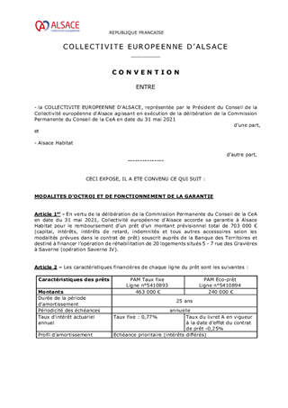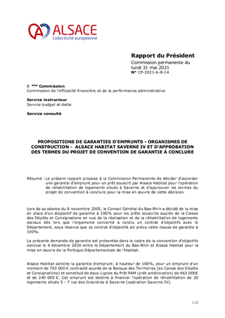 Le présent rapport propose à la Commission Permanente de décider d’accorder une garantie d’emprunt pour un prêt souscrit par Alsace Habitat pour l’opération de réhabilitation de logements situés à Saverne et d’approuver les termes du projet de convention à conclure pour la mise en œuvre de cette décision.