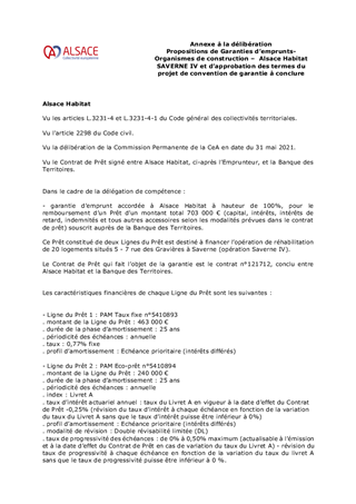 PROPOSITIONS DE GARANTIES D'EMPRUNTS - ORGANISMES DE CONSTRUCTION -ALSACE HABITAT SAVERNE IV ET D'APPROBATION DES TERMES DU PROJET DE CONVENTION DE GARANTIE À CONCLURE