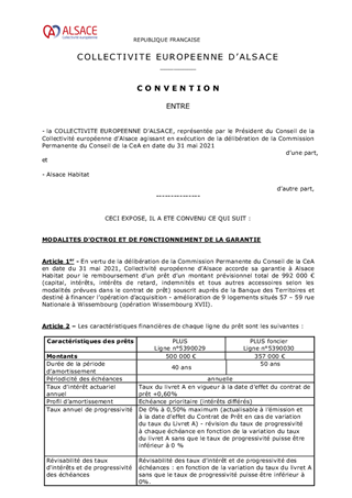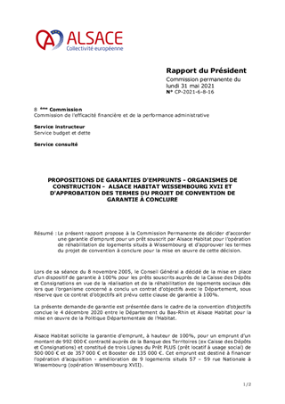 Le présent rapport propose à la Commission Permanente de décider d’accorder une garantie d’emprunt pour un prêt souscrit par Alsace Habitat pour l’opération de réhabilitation de logements situés à Wissembourg et d’approuver les termes du projet de convention à conclure pour la mise en œuvre de cette décision.