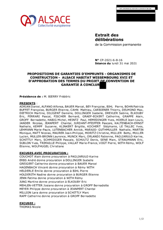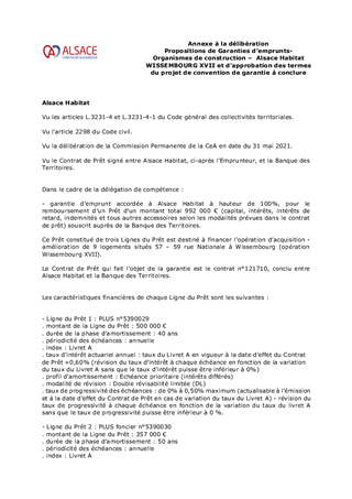 PROPOSITIONS DE GARANTIES D'EMPRUNTS - ORGANISMES DE CONSTRUCTION -ALSACE HABITAT WISSEMBOURG XVII ET D'APPROBATION DES TERMES DU PROJET DE CONVENTION DE GARANTIE À CONCLURE