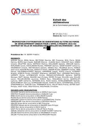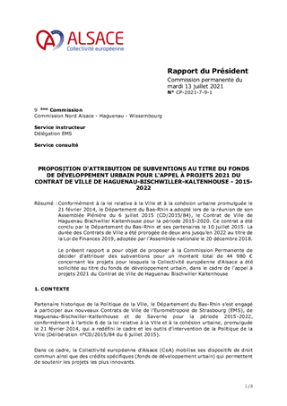 Conformément à la loi relative à la Ville et à la cohésion urbaine promulguée le 21 février 2014, le Département du Bas-Rhin a adopté lors de la réunion de son Assemblée Plénière du 6 juillet 2015 (CD/2015/84), le Contrat de Ville de Haguenau Bischwiller Kaltenhouse pour la période 2015-2020. Ce contrat a été conclu par le Département du Bas-Rhin et ses partenaires le 10 juillet 2015. La durée des Contrats de Ville a été prorogée de deux ans jusqu’en 2022 au titre de la Loi de Finances 2019, adoptée par l'Assemblée nationale le 20 décembre 2018. Le présent rapport a pour objet de proposer à la Commission Permanente de décider d’attribuer des subventions pour un montant total de 44 980 € concernant les projets pour lesquels la Collectivité européenne d'Alsace a été sollicitée au titre du fonds de développement urbain, dans le cadre de l'appel à projets 2021 du Contrat de Ville de Haguenau Bischwiller Kaltenhouse