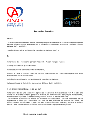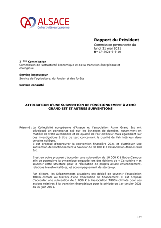 La Collectivité européenne d'Alsace et l'association Atmo Grand Est ont développé un partenariat axé sur les échanges de données, notamment en matière de trafic automobile et de qualité de l'air extérieur mais également sur des investigations à titre de test concernant la qualité de l'air intérieur dans certains collèges. Il est proposé d'approuver la convention financière 2021 et d'attribuer une subvention de fonctionnement à hauteur de 30 000 € à l'association Atmo Grand Est. Il est en outre proposé d’accorder une subvention de 10 000 € à BadenCampus afin de poursuivre la dynamique engagée lors des éditions de « Ca turbine » et soutenir cette structure pour la réalisation de projets alliant environnement, relations transfrontalières, et accompagnement de starts-up. Par ailleurs, les Départements alsaciens ont décidé de soutenir l’association TRION-climate au travers d’une convention de financement. Il est proposé d’accorder une subvention de 1 000 € à l’association TRION-climate pour ses actions relatives à la transition énergétique pour la période du 1er janvier 2021 au 30 juin 2021.