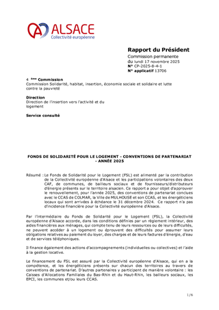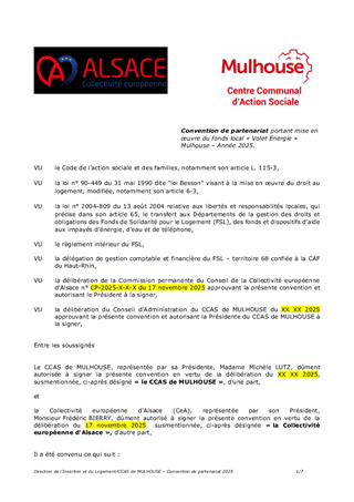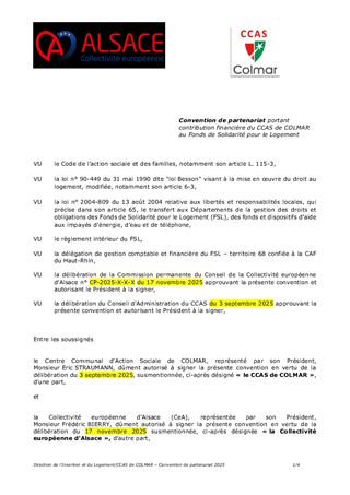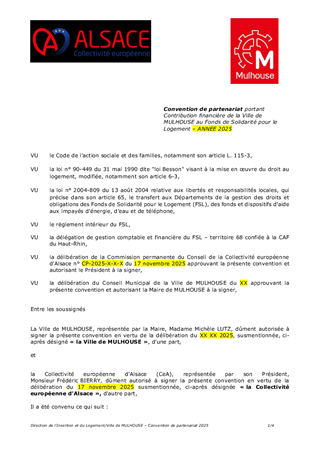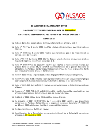 Le Fonds de Solidarité pour le Logement (FSL) est alimenté par la contribution de la Collectivité européenne d'Alsace et les participations volontaires des deux CAF, de communes, de bailleurs sociaux et de fournisseurs/distributeurs d’énergie présents sur le territoire alsacien. Ce rapport a pour objet d'approuver le renouvellement, pour l'année 2025, des conventions de partenariat conclues avec le CCAS de COLMAR, la Ville de MULHOUSE et son CCAS, et les énergéticiens locaux qui sont arrivées à échéance le 31 décembre 2024. Ce rapport n'a pas d'incidence financière pour la Collectivité européenne d'Alsace.