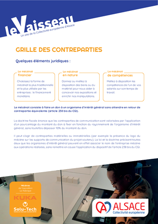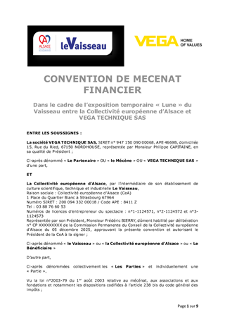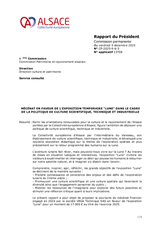 Parmi les orientations renouvelées pour la culture et le rayonnement de l'Alsace portées par la Collectivité européenne d'Alsace, figure l'ambition de déployer une politique de culture scientifique, technique et industrielle. La Collectivité européenne d'Alsace par l'intermédiaire du Vaisseau, son établissement de culture scientifique, technique et industrielle, à développé une nouvelle exposition didactique sur le thème de l'exploration spatiale et plus précisément sur le retour programmé des humains sur la Lune. L'aventure lunaire fait rêver, mais pouvons-nous vivre sur la Lune ? Au travers de mises en situation ludiques et interactives, l'exposition "Lune" invitera les visiteurs à expérimenter et interroger ce désir qui pousse les humains à retourner sur notre satellite naturel, et à imaginer s'y établir dans l'avenir. Comprendre, inspirer, agir, réfléchir, les grands objectifs de l'exposition "Lune" se déclinent de la manière suivante : - Prendre connaissance et conscience des enjeux et des défis de l'exploration lunaire du 21ème siècle ; - Promouvoir une culture scientifique et une culture spatiale qui favorisent la diversité ainsi que l'engagement personnel du public ; - Mobilier les ressources de l'imaginaire pour explorer des futurs possibles et stimuler une réflexion critique quant à leurs implications. Le présent rapport a pour objet de proposer la poursuite du mécénat financier engagé en 2024 par la société VEGA Technique SAS en faveur de l'exposition "Lune" pour un montant de 17 000 € au titre de l'exercice 2025.