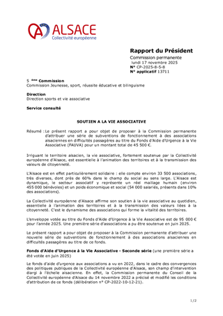 Le présent rapport a pour objet de proposer à la Commission permanente d’attribuer une série de subventions de fonctionnement à des associations alsaciennes en difficultés passagères au titre du Fonds d’Aide d’Urgence à la Vie Associative (FAUVA) pour un montant total de 45 500 €.