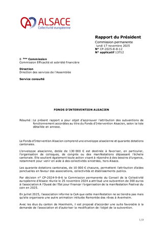 Le présent rapport a pour objet d'approuver l'attribution des subventions de fonctionnement accordées au titre du Fonds d'Intervention Alsacien, selon la liste détaillée en annexe.