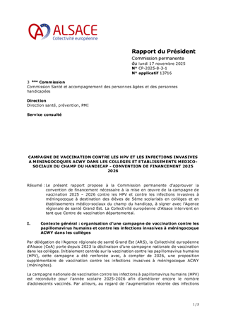 Le présent rapport propose à la Commission permanente d’approuver la convention de financement nécessaire à la mise en œuvre de la campagne de vaccination 2025 – 2026 contre les HPV et contre les infections invasives à méningocoque à destination des élèves de 5ème scolarisés en collèges et en établissements médico-sociaux du champ du handicap, à signer avec l’Agence régionale de santé Grand Est. La Collectivité européenne d’Alsace intervient en tant que Centre de vaccination départemental.