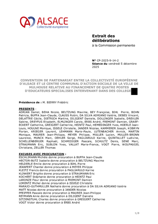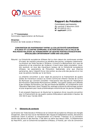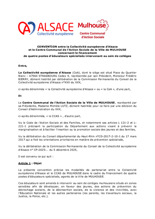 La Collectivité européenne d'Alsace fait le choix depuis de nombreuses années d'investir de manière préventive au bénéfice des jeunes, collégiens notamment. La direction de l'Aide Sociale à l'Enfance, à travers le déploiement d'un plan de prévention et de protection de l'enfance, s'inscrit dans cette orientation. Ainsi, elle soutient, en plus des travailleurs sociaux de la Collectivité européenne d'Alsace, les associations de Prévention Spécialisée, ainsi que d’autres partenaires, dans l’objectif d’une intervention au plus près des jeunes et en lien avec les actions menées sur le territoire. La présente convention a pour objet de poursuivre le financement de quatre postes de travailleurs sociaux au Centre Communal d'Action Sociale de la Ville de Mulhouse qui viennent compléter l’intervention des équipes de l’Association de Prévention Spécialisée Mulhousienne (APSM). Ces quatre postes sont affectés à des collèges mulhousiens, par des permanences dédiées, en collaboration avec l’Education Nationale, dans l’objectif du repérage précoce du décrochage scolaire et plus largement pour toute problématique rencontrée par les jeunes collégiens. Il est proposé d’approuver et d'autoriser la signature d’une nouvelle convention pour le financement de ces quatre postes d’éducateurs spécialisés à hauteur de 142 332 € pour l’année 2025.