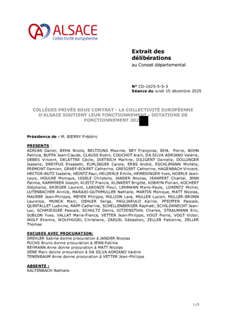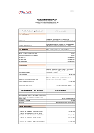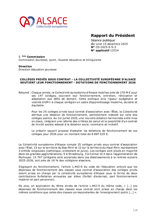 Chaque année, la Collectivité européenne d’Alsace mobilise près de 170 M € pour ses 147 collèges, couvrant leur fonctionnement, entretien, rénovation et adaptation aux défis de demain. Cette politique allie rigueur budgétaire et volonté d’offrir à chaque collégien un cadre d’apprentissage moderne, durable et équitable. Pour les 25 collèges privés sous contrat d’association avec l’État, la Collectivité attribue une dotation de fonctionnement, partiellement indexée sur celle des collèges publics. Au 1er juillet 2025, une nouvelle dotation harmonisée a été mise en place, intégrant une refonte des critères de calcul et la possibilité d’un contrat de mixité sociale adossé à la dotation socle, volontaire et incitatif. Le présent rapport propose d’adopter les dotations de fonctionnement de ces collèges pour 2026 pour un montant total de 8 887 629 €.