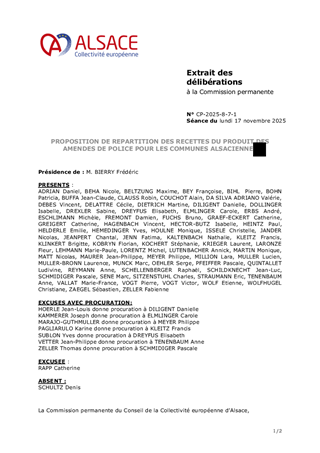 La Collectivité européenne d’Alsace a adopté en séance du 30 juin 2025 de nouvelles règles d’instruction communes à l’ensemble des communes alsaciennes pour la répartition de la dotation des amendes de police. Dans ce cadre, le présent rapport a pour objet de proposer à la Commission Permanente une répartition de l’enveloppe financière en faveur de 22 communes et 1 communauté de communes pour un montant total de 1 119 355 €. Ces crédits doivent être affectés au financement d’opérations d’amélioration des transports en commun et de la circulation routière, énumérées à l’article R 2334-12 du Code Général des Collectivités Territoriales (CGCT), réalisées par les collectivités regroupant moins de dix mille habitants. Cette répartition s’appuie sur une dotation dont le montant notifié au 26 juin 2025 s’élève à 8 461 590,44 € pour les communes alsaciennes.