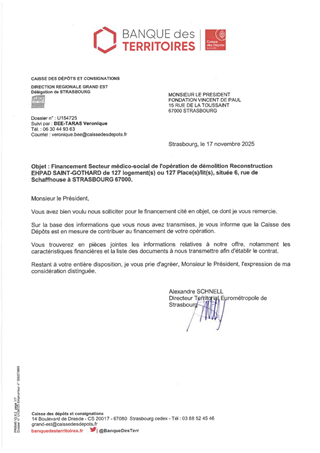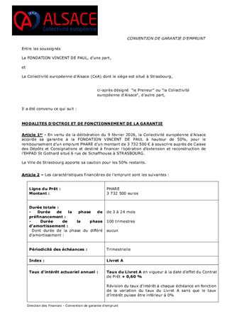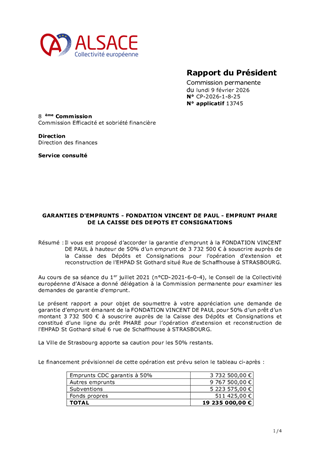 Il vous est proposé d’accorder la garantie d'emprunt à la FONDATION VINCENT DE PAUL à hauteur de 50% d’un emprunt de 3 732 500 € à souscrire auprès de la Caisse des Dépôts et Consignations pour l’opération d’extension et reconstruction de l'EHPAD St Gothard situé Rue de Schaffhouse à STRASBOURG.