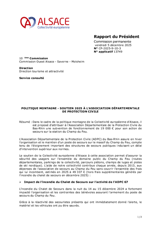 Dans le cadre de la politique montagne de la Collectivité européenne d'Alsace, il est proposé d’attribuer à l’Association Départementale de la Protection Civile du Bas-Rhin une subvention de fonctionnement de 19 000 € pour son action de secours sur la station du Champ du Feu.