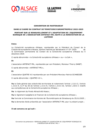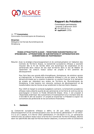 Avec la stratégie d’accompagnement et de contractualisation et l’adoption des Contrats de Territoire Alsace, la Collectivité européenne d’Alsace a souhaité impulser dès la fin de l’année 2022 une dynamique de coopération et de partenariats dans chacun de ses sept territoires dans le but de fédérer et rassembler les acteurs locaux autour de projets à fort potentiel de développement. Pour faire face aux grands défis énergétiques, écologiques, de cohésion sociale et d’attractivité, la Collectivité européenne d’Alsace a mis en place le Fonds Attractivité Alsace qui a vocation à apporter un soutien financier à la réalisation de projets qui répondent aux enjeux du Territoire de l’Eurométropole de Strasbourg, à des besoins non couverts, porteurs de développement et de transformation des territoires et qui améliorent le Service Public Alsacien. Pour 2025 et malgré le contexte budgétaire contraint, la Collectivité européenne d’Alsace reste présente auprès de ses partenaires en territoire et continue de les accompagner à travers le Fonds Attractivité Alsace. Ainsi, il est proposé à l’Assemblée d’attribuer des subventions d'investissement d'un montant total de 3 616 803 € afin de soutenir 17 projets et d'autoriser le Président à signer les conventions de partenariat et les conventions financières.
