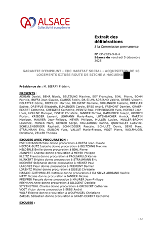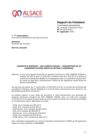 Il vous est proposé d’accorder la garantie d'emprunt à CDC HABITAT SOCIAL à hauteur de 100 % pour un prêt d’un montant total de 4 210 973 € à souscrire auprès de la Caisse des Dépôts et Consignations pour une opération d’acquisition en vente en état futur d'achèvement (VEFA) de 39 logements situés Route de Bitche à HAGUENAU.