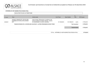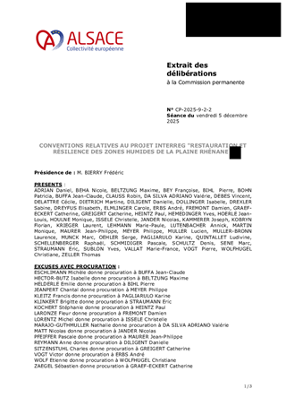 Le projet INTERREG « Restauration et résilience des zones humides de la plaine rhénane », porté par la Collectivité européenne d’Alsace (CeA) est mené en partenariat avec 16 autres partenaires français et allemands. Il vise à restaurer des zones humides via des sites pilotes français et allemands et à créer un lieu d’échange transfrontalier sur la préservation des zones humides de plaine dans le Rhin Supérieur. Le présent rapport propose à la Commission permanente de la Collectivité européenne d'Alsace d’approuver, d'une part, les termes de la convention de partenariat associant l'ensemble des partenaires du projet et d’attribuer, d'autre part, une subvention de 6 752.92 € à l’un des partenaires du projet, l’Office des données naturalistes du Grand Est (ODONAT).