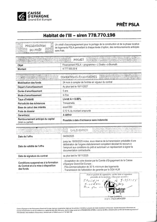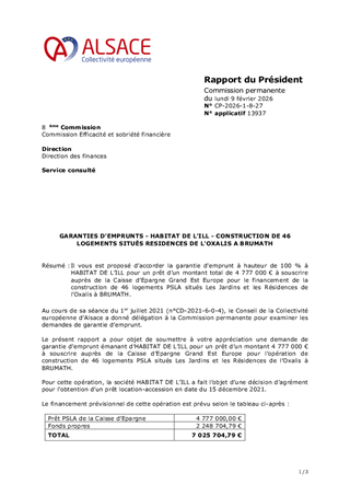 Il vous est proposé d’accorder la garantie d'emprunt à hauteur de 100 % à HABITAT DE L’ILL pour un prêt d’un montant total de 4 777 000 € à souscrire auprès de la Caisse d’Epargne Grand Est Europe pour le financement de la construction de 46 logements PSLA situés Les Jardins et les Résidences de l’Oxalis à BRUMATH.