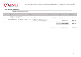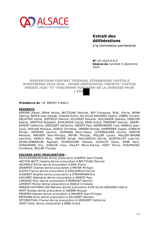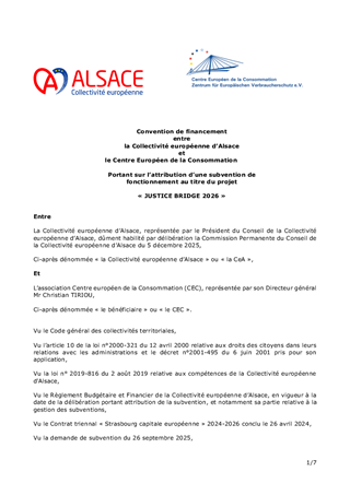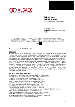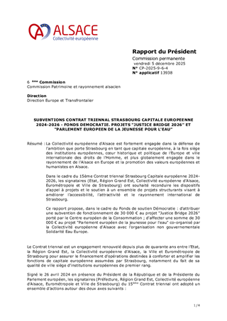 La Collectivité européenne d'Alsace est fortement engagée dans la défense de l’ambition que porte Strasbourg en tant que capitale européenne, à la fois siège des institutions européennes, cœur historique et politique de l’Europe et ville internationale des droits de l’Homme, et plus globalement engagée dans le rayonnement de l'Alsace en Europe et la promotion des valeurs européennes et humanistes en Alsace. Dans le cadre du 15ème Contrat triennal Strasbourg Capitale européenne 2024-2026, les signataires (Etat, Région Grand Est, Collectivité européenne d’Alsace, Eurométropole et Ville de Strasbourg) ont souhaité reconduire les dispositifs d'appel à projets et le soutien à un ensemble de projets structurants visant à améliorer l’accessibilité, l'attractivité et le rayonnement international de Strasbourg. Ce rapport propose, dans le cadre du Fonds de soutien Démocratie : d'attribuer une subvention de fonctionnement de 30 000 € au projet "Justice Bridge 2026" porté par le Centre européen de la Consommation ; d'affecter une somme de 30 000 € au projet "Parlement européen de la jeunesse pour l'eau" co-organisé par la Collectivité européenne d'Alsace avec l’organisation non gouvernementale Solidarité Eau Europe.
