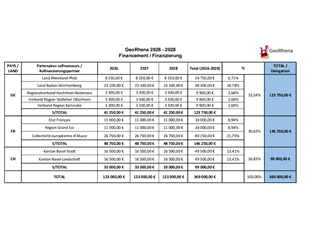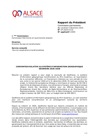 Le présent rapport a pour objet la poursuite de GeoRhena, le système d’information géographique transfrontalier du Rhin Supérieur, et l'approbation de la convention afférente. Le financement s'étendra sur une période de trois ans, entre le 1er janvier 2026 et le 31 décembre 2028. En tant que porteur du projet, la Collectivité européenne d'Alsace y contribuera à hauteur de 80 250 € sous forme de dépenses directes. Les cofinanceurs français, allemands et suisses (Région Grand Est, Secrétaire Général pour les Affaires Régionales et Européennes Grand Est, Länder de Bade-Würtemberg et de Rheinland-Pfalz, Regionalverbände, Cantons de Bâle-Ville et Bâle-Campagne) contribueront au projet à hauteur de 288 750 €, pour un budget total de 369 000 €.