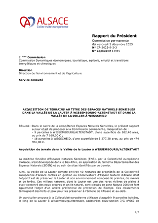 ACQUISITION DE TERRAINS AU TITRE DES ESPACES NATURELS SENSIBLES DANS LA VALLÉE DE LA LAUTER À WISSEMBOURG-ALTENSTADT ET DANS LA VALLÉE DE LA DOLLER À WEGSCHEID