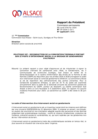 Le présent rapport a pour objet d'approuver et de m'autoriser à signer la convention triennale de partenariat avec l'Etat, la Gendarmerie, les 3 Communautés de communes Sundgau, Sud Alsace et Vallée de la Doller/Soultzbach et le Centre d'Information des Droits de la Femme et des Familles (CIDFF) du Haut-Rhin pour les années 2026 à 2028 prorogeant le poste d'un intervenant social à l'unité de gendarmerie d'Altkirch. La convention précise la clé de répartition des cofinancements des parties prenantes. Pour la Collectivité européenne d'Alsace, la part de 25 % du poste est examinée annuellement dans le cadre de la demande annuelle de subvention globale de fonctionnement du CIDFF, porteur du dispositif. La 15ème commission Sud Alsace a émis un avis favorable le 5 septembre 2025. Ce rapport n'a aucune incidence financière pour 2025. La subvention au CIDFF a été votée le 30 juin 2025.