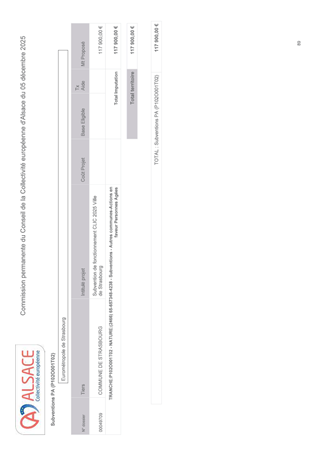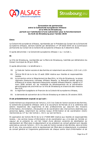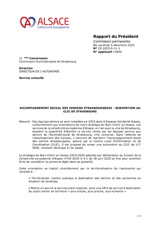Des équipes séniors se sont installées en 2025 dans 6 Espaces Solidarité Alsace, conformément aux orientations de notre stratégie du Bien Vieillir en Alsace. Les services de la collectivité européenne d'Alsace, en lien avec la ville de Strasbourg, étudient la possibilité d'étendre le service rendu par les équipes seniors aux seniors de l'Eurométropole de Strasbourg, ville comprise. Dans l'attente de l'aboutissement des travaux, il convient de maintenir l'accompagnement social des seniors strasbourgeois, assuré par le Centre Local d'Information et de Coordination (CLIC). Il est proposé de verser une subvention au CLIC de 117 900€, montant identique à l'an passé.