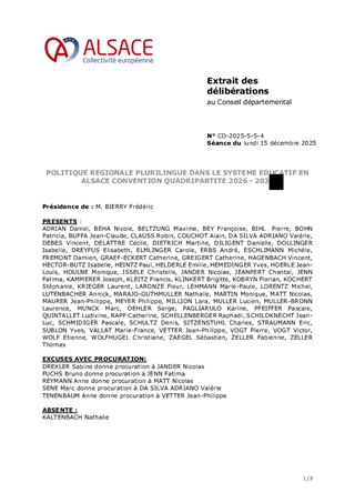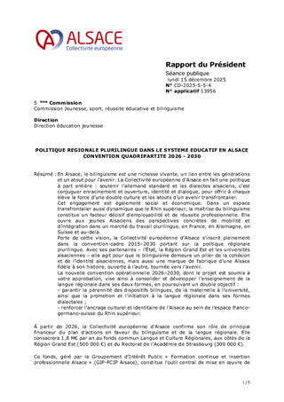 En Alsace, le bilinguisme est une richesse vivante, un lien entre les générations et un atout pour l’avenir. La Collectivité européenne d’Alsace en fait une politique à part entière : soutenir l’allemand standard et les dialectes alsaciens, c’est conjuguer enracinement et ouverture, identité et dialogue, pour offrir à chaque élève la force d’une double culture et les atouts d’un avenir transfrontalier. Cet engagement est également social et économique. Dans un espace transfrontalier aussi dynamique que le Rhin supérieur, la maîtrise du bilinguisme constitue un facteur décisif d’employabilité et de réussite professionnelle. Elle ouvre aux jeunes Alsaciens des perspectives concrètes de mobilité et d’intégration dans un marché du travail plurilingue, en France, en Allemagne, en Suisse et au-delà. Forte de cette vision, la Collectivité européenne d’Alsace s’inscrit pleinement dans la convention-cadre 2015–2030 portant sur la politique régionale plurilingue. Avec ses partenaires – l’État, la Région Grand Est et les universités alsaciennes – elle agit pour que le bilinguisme demeure un pilier de la cohésion et de l’identité alsaciennes, mais aussi une marque de fabrique d’une Alsace fidèle à son histoire, ouverte à l’autre, tournée vers l’avenir. La nouvelle convention opérationnelle 2026–2030, dont le projet est soumis à votre approbation, vise ainsi à consolider et développer l’enseignement de la langue régionale dans ses deux formes, en poursuivant un double objectif : - garantir la pérennité des dispositifs bilingues, de la maternelle à l’université, ainsi que la promotion et l’initiation à la langue régionale dans ses formes dialectales ; - renforcer l’ancrage culturel et identitaire de l’Alsace au sein de l’espace franco-germano-suisse du Rhin supérieur.