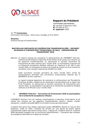 Le rapport propose de reconduire le cofinancement de l'INFOBEST Palmrain, instance transfrontalière trinationale d'information et de conseil aux citoyens sur les questions transfrontalières, en approuvant la nouvelle convention de financement de cette instance pour l’année 2026. La participation financière de la Collectivité européenne d'Alsace s’élèvera au maximum à 67 204 € pour l’année 2026, se composant du salaire du chargé de mission et d'une somme en numéraire, d'un montant maximal de 20 000 € en 2026. Cette convention annuelle permettra de rallier l’année 2027, année de renouvellement simultané des conventions pluriannuelles relatives aux 4 INFOBESTs du Rhin supérieur. Le rapport propose également de reconduire le cofinancement de l’Eurodistrict trinational de Bâle, plateforme de coopération transfrontalière de la région des Trois Frontières, en approuvant la nouvelle convention de financement pour l’année 2026. La participation financière de la Collectivité européenne d'Alsace s’élèvera à 26 976,55 € pour l’année 2026.