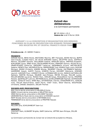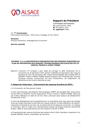 L'avenant n°2 proposé a pour objet de proroger le délai d'exécution de la convention du 8 septembre 2015 portant modalités d'organisation des mesures foncières du plan de prévention des risques technologiques des sociétés PPC et CRISTAL France à VIEUX-THANN jusqu'à exécution de l'ensemble des mesures foncières prévues (comprenant les frais d'acquisition, de diagnostics, de démolition et de mise en sécurité du site).